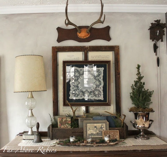 I changed a few things on the buffet including adding this inherited vintage lamp, and my dwarf Alberta Spruce in the ice bucket.